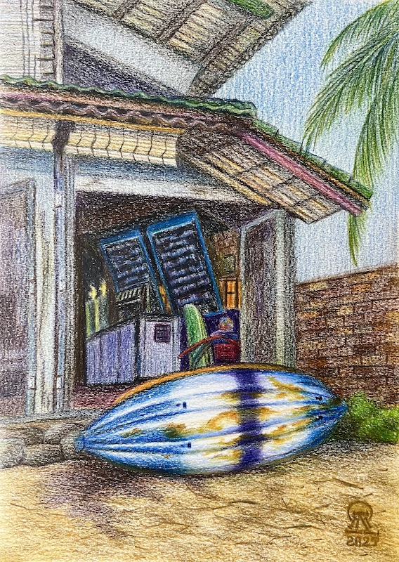 На фото работа автора. Фукуок. Старая лодка. Бумага, масляный карандаш. 30х21 см. 2025 г.